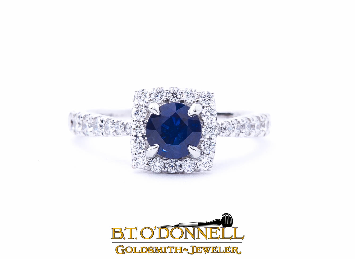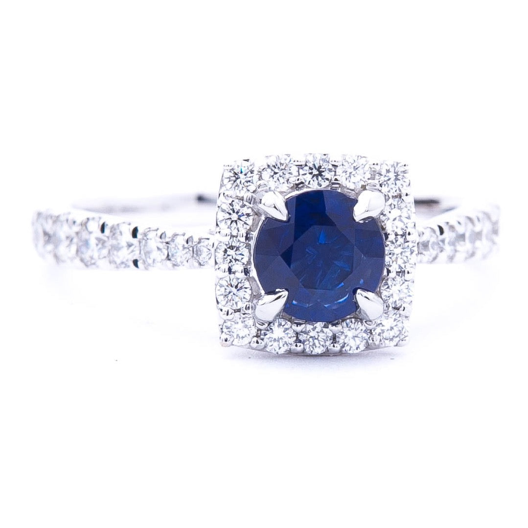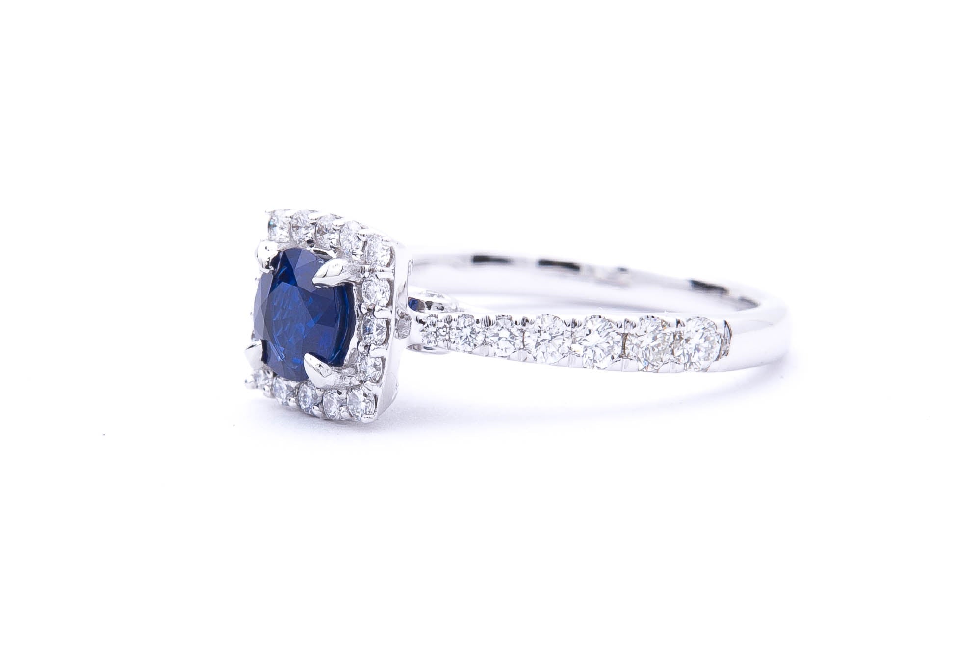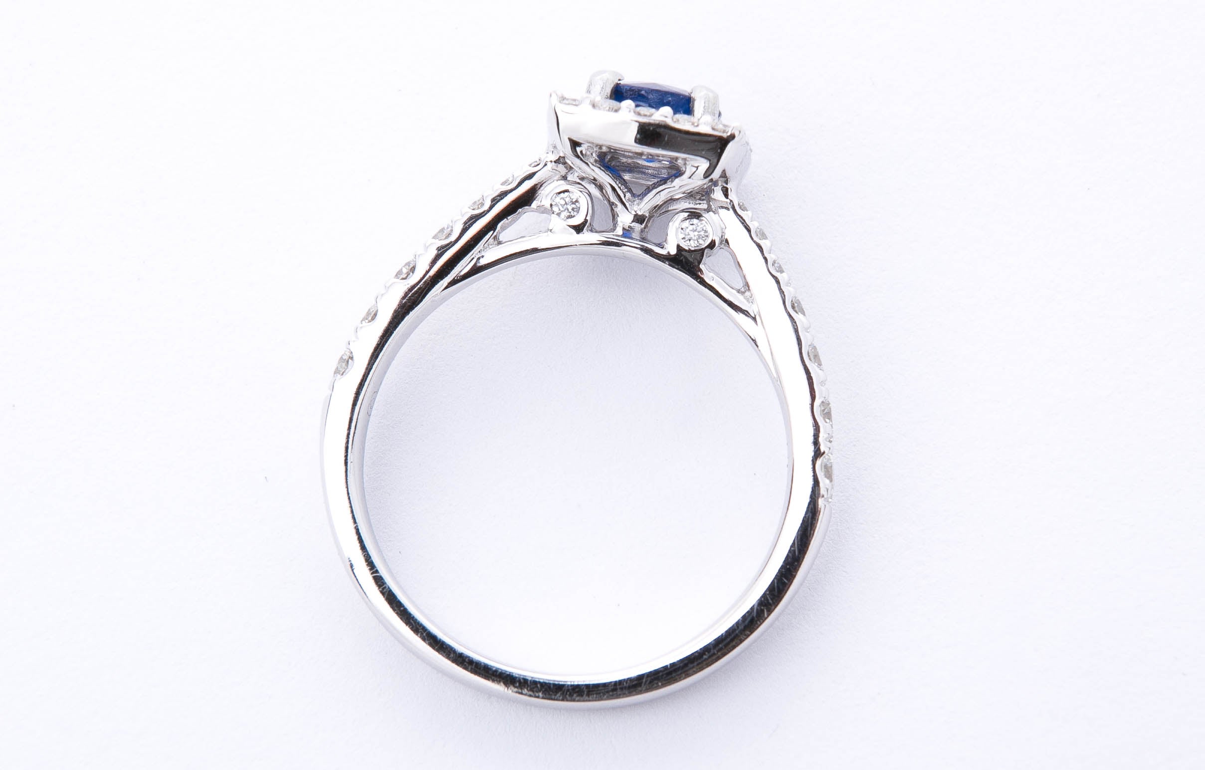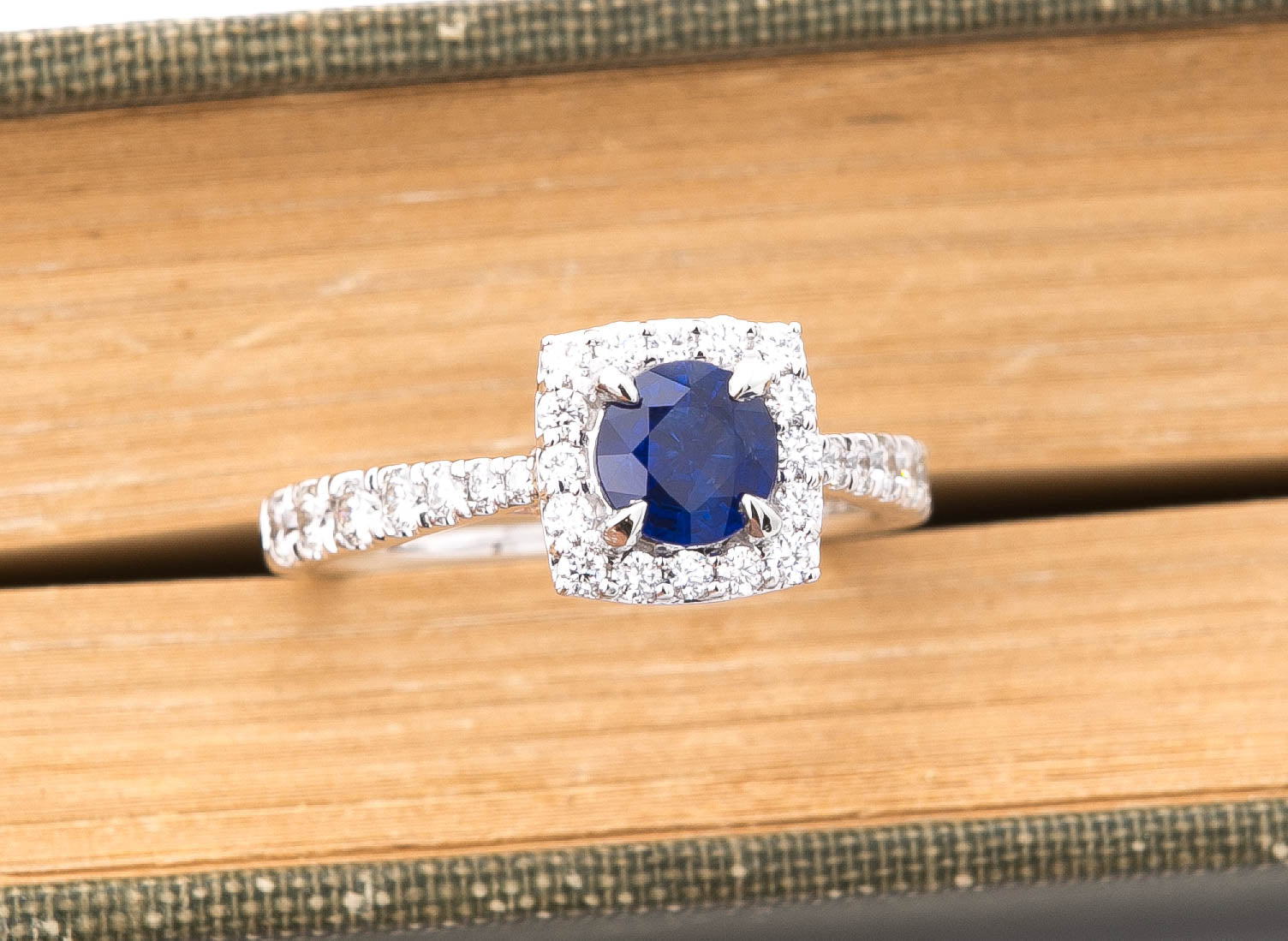 Stunning deep blue sapphire set into a vivid diamond ring.