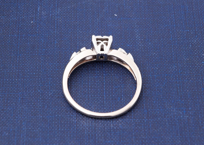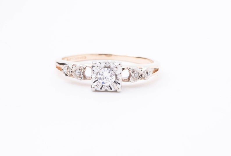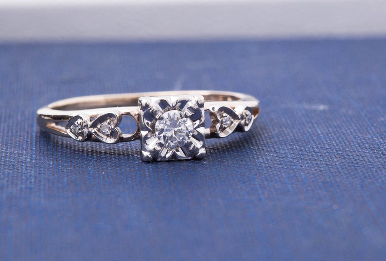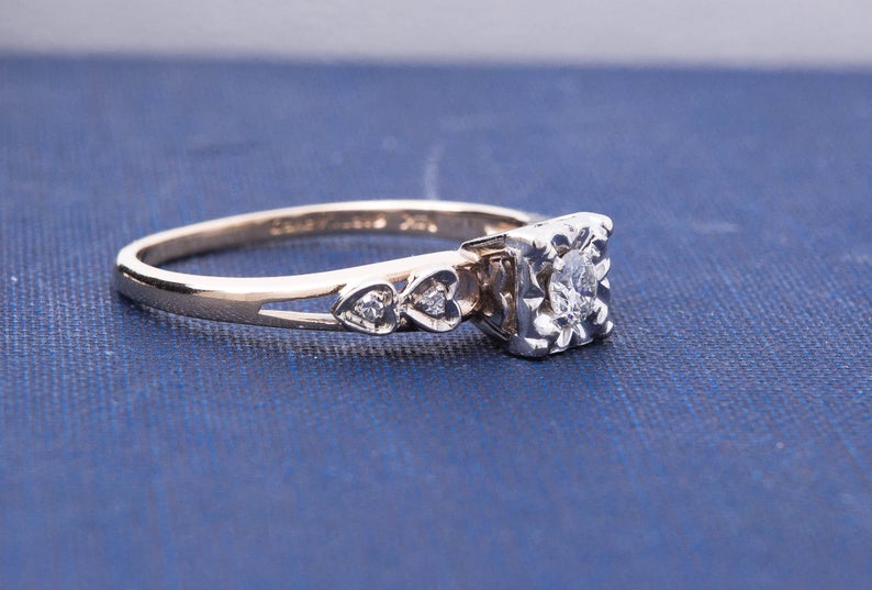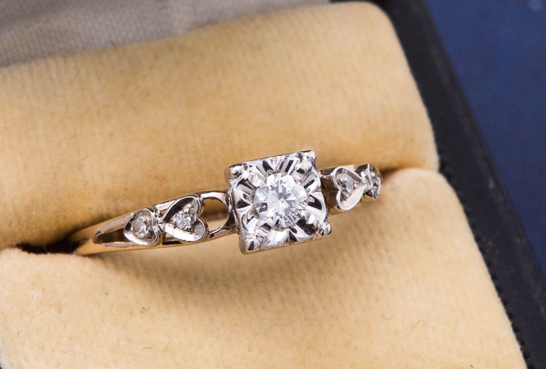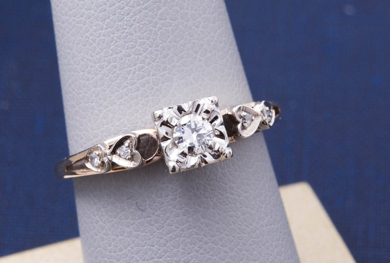 Vintage Diamond Engagement Ring - Diamond Ring with Heart Accents - 14 Karat Yellow and White Gold