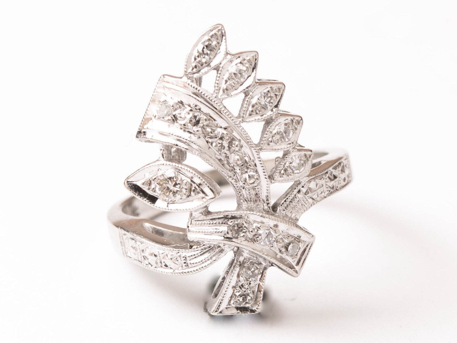 Estate Diamond Ring - Unique Art Deco design made in solid 14k white gold. Very nice weight to this ring, very well made. A stunning piece that is very eye catching.